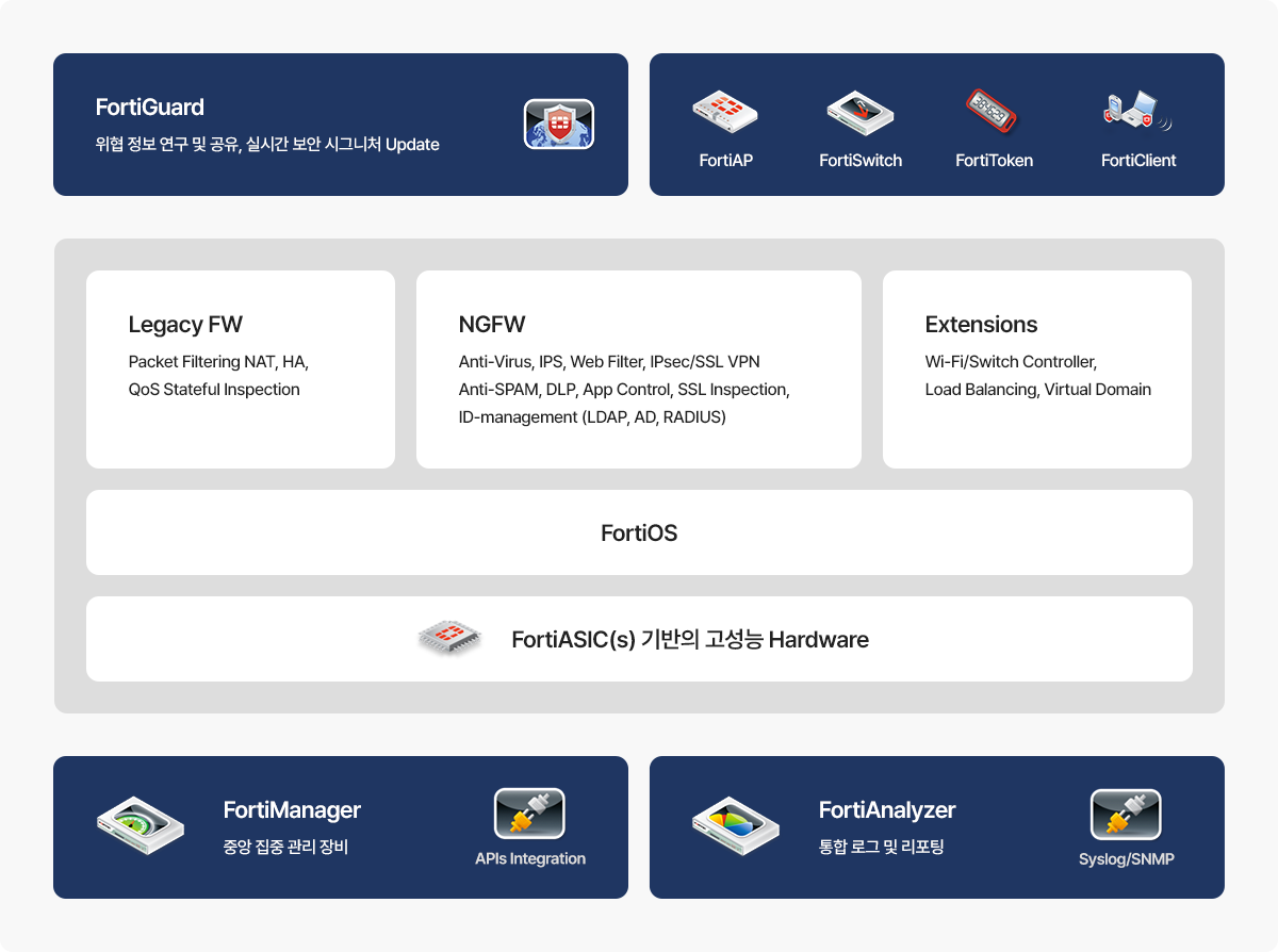 포티넷 NGFW은 자체 설계한 ASIC 기반의 고성능 Hardware 구조에, 최신 보안 위협 정보와 시그니처를 통해 고객 비즈니스를 보호하며, 고도의 제어와 가시성을 제공합니다.